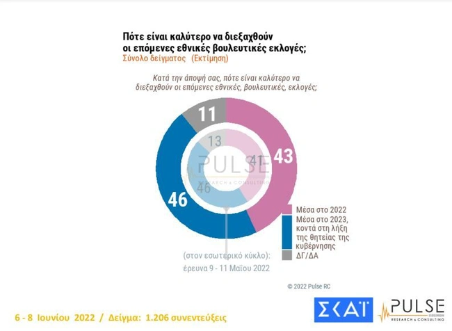 Ως προς το ερώτημα πότε είναι καλύτερο να διεξαχθούν οι επόμενες εθνικές εκλογές το 46% απαντά το 2023, το 43% λέει μέσα στο 2022 και το 11% απαντά Δεν ξέρω/Δεν απαντώ.