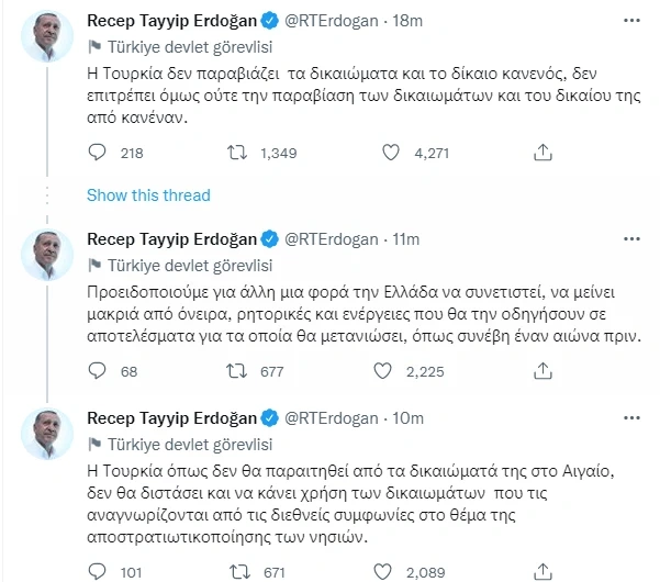 Τα tweets του προέδρου της Τουρκίας, Ρετζέπ Ταγίπ Ερντογάν, στα ελληνικά σχολίασε ο κυβερνητικός εκπρόσωπος, Γιάννης Οικονόμου. Ο κ. Οικονόμου τόνισε χαρακτηριστικά πως «είναι αξιοπρόσεκτο ότι ο Πρόεδρος Ερντογάν επέλεξε να εκφραστεί στα ελληνικά. Είναι γνωστό ότι η ελληνική είναι η γλώσσα της λογικής, της ελευθερίας και του δικαίου. Οι μητρικοί της χρήστες και ο δυτικός κόσμος το γνωρίζουν άριστα. Η τακτική που έχει επιλέξει η Τουρκία δεν εμπίπτει σε καμία από αυτές τις εκδοχές».