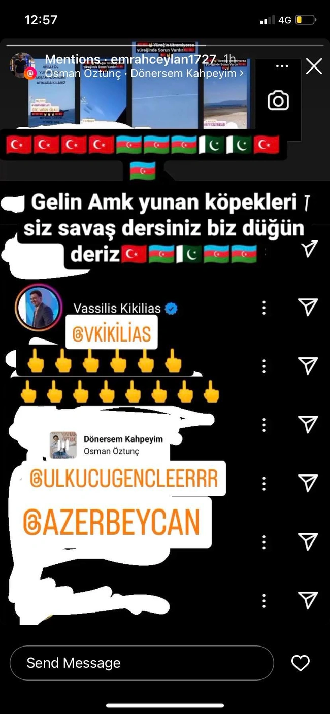 Υπενθυμίζεται ότι ο υπουργός Τουρισμού, Βασίλης Κικίλιας, βρέθηκε στο στόχαστρο των διαδοχικών προκλήσεων από την τουρκική πλευρά, καθώς κατέκλυσαν τον λογαριασμό του στο Instagram με απειλές και ύβρεις κατά της Ελλάδας αλλά και του ίδιου. Τούρκοι χρήστες του social media άφησαν διαδικτυακές απειλές στον λογαριασμό του κ. Κικίλια ποστάροντας φωτογραφίες και σημαίες της Τουρκίας και του Αζερμπαϊτζάν αλλά και την πράσινη ισλαμιστική με την ημισέληνο.