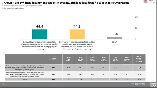 Σύμφωνα με τις Τάσεις της MRB η ψαλίδα βρίσκεται στο 7,2% με τη Νέα Δημοκρατία να έχει 29,3%, τον ΣΥΡΙΖΑ 22,1%, το ΠΑΣΟΚ-Κίνημα Αλλαγής 12,2%, το ΚΚΕ 4,7%, η Ελληνική Λύση 4,5%, το ΜέΡΑ25 3,1%, οι Ελληνες για την Πατρίδα 1,9% και η Εθνική Δημιουργία 1,2%. «Αλλο Κόμμα» επέλεξε το 7% των ερωτηθέντων, ενώ το ποσοστό της «Αδιευκρίνιστης Ψήφου» αγγίζει το 14%.