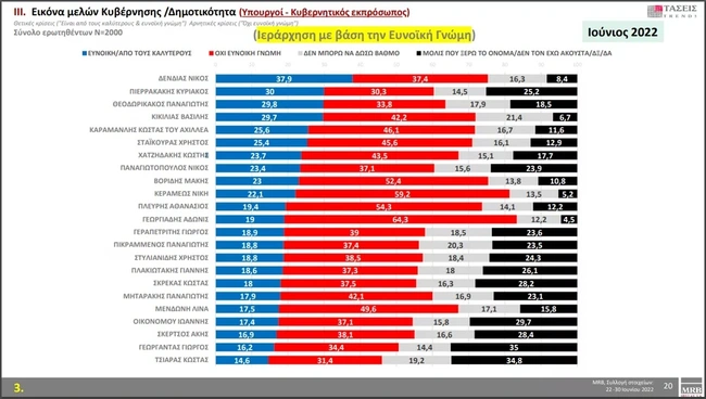 Από τους υπουργούς πρώτος στις προτιμήσεις του κόσμου είναι ο Υπουργός Εξωτερικών Νίκος Δένδιας με 37,9%. Στην δεύτερη θέση βρίσκεται ο Υπουργός Ψηφιακής Διακυβέρνησης Κυριάκος Πιερρακάκης με 30% και ακολουθεί σε απόσταση αναπνοής ο Τάκης Θεοδωρικάκος.