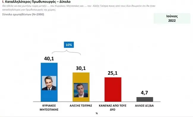 Στο ερώτημα «Ποιος από τους δύο θεωρείτε ότι θα ήταν καταλληλότερος για πρωθυπουργός της χώρας;», ο πρωθυπουργός Κυριάκος Μητσοτάκης και πρόεδρος της Ν.Δ. συγκεντρώνει το 40,1% των ερωτηθέντων και ο πρόεδρος του ΣΥΡΙΖΑ 30,1%. «Κανένας από τους δύο» απαντά το 25,1%.