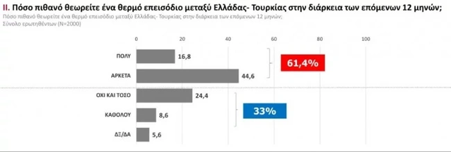 Το μεγάλο πρόβλημα για τους πολίτες είναι η ανεργία, ενώ η συντριπτική πλειοψηφία (61,4%) θεωρεί πολύ πιθανό να υπάρξει θερμό επεισόδιο μεταξύ Ελλάδας-Τουρκίας στη διάρκεια των επόμενων 12 μηνών.