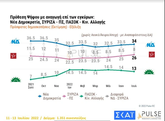 Στις 8 ποσοστιαίες μονάδες διαμορφώνεται η διαφορά μεταξύ της Νέας Δημοκρατίας και του ΣΥΡΙΖΑ, με το κυβερνών κόμμα να συγκεντρώνει το 34% των προτιμήσεων των ψηφοφόρων, έναντι 26% που προτιμά τον ΣΥΡΙΖΑ, σύμφωνα με μεγάλη δημοσκόπηση της εταιρείας Pulse για λογαριασμό του ΣΚΑΪ. Η δημοσκόπηση διεξήχθη πανελλαδικά το διάστημα από 11 έως 13 Ιουλίου 2022 και συμμετείχαν 1.351 πολίτες κάθε ηλικίας.