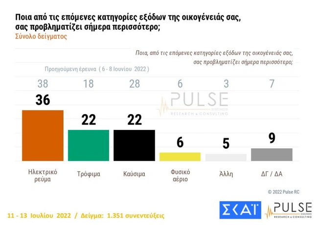 Σε ερώτηση για το πότε πρέπει να διεξαχθούν οι εκλογές, η πλειοψηφία των πολιτών που συμμετείχαν στην έρευνα της Pulse απάντησε μέσα στο 2023. Όσον αφορά στην τουρκική προκλητικότητα, πάνω από τους μισούς πολίτες δήλωσαν ότι ανησυχούν για τις εξελίξεις, ενώ σε ότι αφορά τα οικονομικά, η ελληνική οικογένεια αντιμετωπίζει μεγαλύτερη πίεση λόγω των αυξημένων τιμών στο ρεύμα, ενώ ακολουθούν οι αυξήσεις στα τρόφιμα.