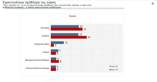Ποσοστό 60% πιστεύει ότι η χώρα κινείται προς τη λάθος κατεύθυνση και το 33% προς τη σωστή. Ως σημαντικότερο πρόβλημα αυτή την εποχή οι Ελληνες κρίνουν ότι είναι η οικονομία, μαζί με την ακρίβεια, με ποσοστό 27%. Αυτονόητο δηλαδή εν μέσω μιας πρωτοφανούς ενεργειακής κρίσης και έκρηξης του πληθωρισμού, το γεγονός ότι 54% βάζουν ως κορυφαία προβλήματα την οικονομία και την ακρίβεια.