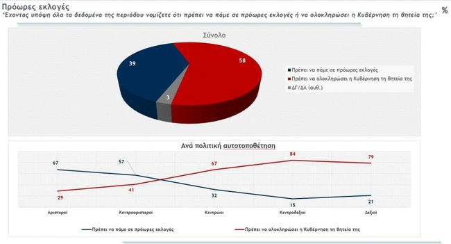 Στο ερώτημα αν πρέπει να πάμε σε πρόωρες εκλογές ή όχι, το 58% λέει ότι η κυβέρνηση πρέπει να ολοκληρώσει τη θητεία της και το 39% ότι πρέπει να στηθούν κάλπες. Αυτονόητα, κεντροδεξιοί και δεξιοί δεν θέλουν τώρα εκλογές (15 και 21 αντίστοιχα).