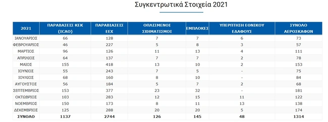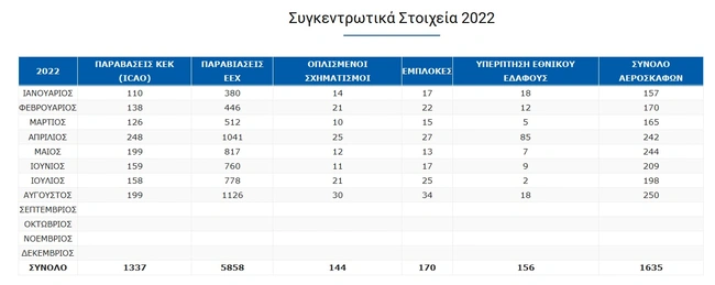 Σε αυτές τις συνθήκες, το χρονικό διάστημα Ιανουάριος - Αύγουστος 2022 καταγράφηκαν συνολικά 5.858 παραβιάσεις του εθνικού εναέριου χώρου όταν κατά τη διάρκεια του 2021 οι παραβιάσεις ανήλθαν σε 2.744. Από τα στοιχεία προκύπτει ότι οι παραβιάσεις αυξήθηκαν κατά 113% σε σχέση με το 2021.