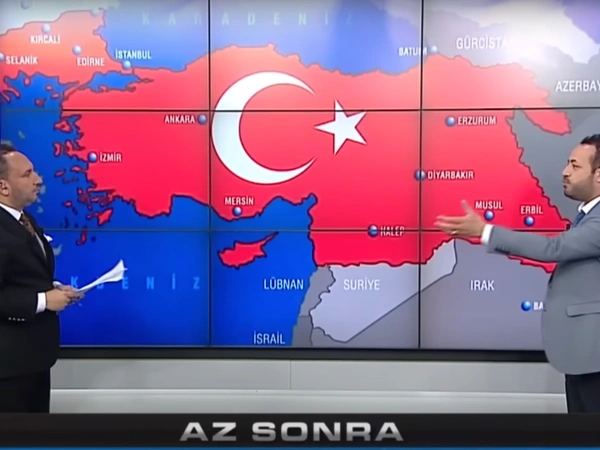 «Το Αιγαίο, ο Εύξεινος Πόντος και η ανατολική Μεσόγειος θα μετατραπούν πλήρως σε μία τουρκική λίμνη», αναφέρει ενδεικτικά ο Τούρκος αναλυτής, ο οποίος επικαλείται χάρτη με τα νέα σύνορα της Τουρκίας μέχρι το 2025, ο οποίος «έχει διαρρεύσει». «Τι σύνορα θα έχει η Τουρκία το 2025 και πως προβλέπεται αυτό;», ρωτάει κάποια στιγμή ο παρουσιαστής, με τον αναλυτή να απαντάει: «Αυτός ο χάρτης διέρρευσε. Ορίστε κύριε!».
