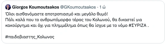 «Όλοι αισθανόμαστε αποτροπιασμό και μεγάλο θυμό! Πάλι καλά που το ανθρωπόμορφο τέρας του Κολωνού θα δικαστεί για κακούργημα και όχι για πλημμέλημα, όπως θα ίσχυε με το νόμο Σύριζα» ανέφερε ο Γιώργος Κουμουτσάκος και λίγη ώρα αργότερα διέγραψε το σχετικό tweet.