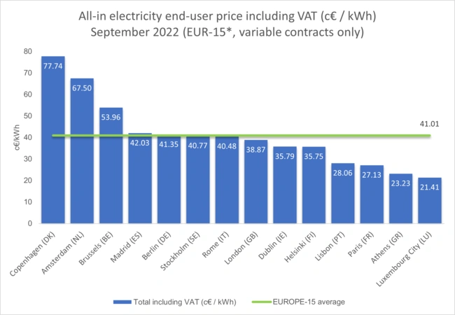 Ετερος πίνακας που επικαλείται το ΥΠΕΝ δείχνει ότι η τιμή λιανικής στην Ελλάδα (χώρες με κυμαινόμενα τιμολόγια) είναι η δεύτερη φθηνότερη στην Ευρώπη τον Σεπτέμβριο 2022.