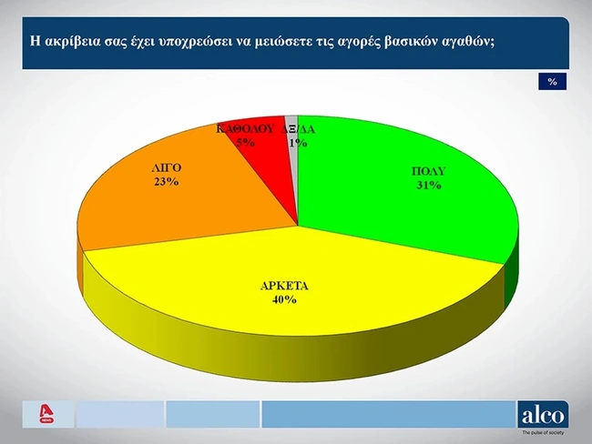 Στο ερώτημα για το αν η ακρίβεια σας έχει υποχρεώσει να μειώσετε τις αγορές βασικών αγαθών; Το 40% απάντησε «αρκετά», το 31% «πολύ», το 23% «λίγο», το 5% «καθόλου», 1% ΔΞ/ΔΑ.