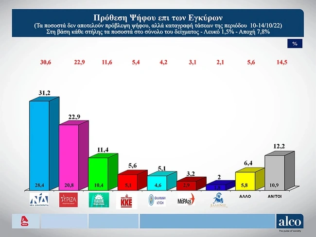Στη δημοσκόπηση της εταιρείας Alco για τον Alpha η διαφορά της Νέας Δημοκρατίας από τον ΣΥΡΙΖΑ βρίσκεται στις 8,3 μονάδες. Η ακρίβεια, τα ελληνοτουρκικά και το καλάθι του νοικοκυριού στα ερωτήματα που απάντησαν οι πολίτες. Η δημοσκόπηση πραγματοποιήθηκε μεταξύ 1.002 ψηφοφόρων από τις 10 έως τις 14 Οκτωβρίου