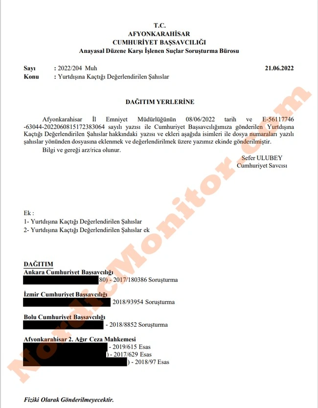 Το έγγραφο, με ημερομηνία 21 Ιουνίου 2022, ανέφερε πληροφορίες που προέρχονταν από ένα επαρχιακό αστυνομικό τμήμα στις 8 Ιουνίου, το οποίο στην πραγματικότητα είχε προέλθει από την Emniyet μια μέρα νωρίτερα. Ανέφερε ότι έξι άτομα εντοπίστηκαν στη Νορβηγία, την Ολλανδία και την Ελλάδα και διέταξε τις κατάλληλες νομικές ενέργειες εναντίον τους. Δεν είναι σαφές πόσα άτομα κατασκοπεύτηκαν από Τούρκους διπλωμάτες. Το συνημμένο έγγραφο, με την πλήρη λίστα των ονομάτων που διαβιβάστηκε από το Υπουργείο Εξωτερικών, λείπει.