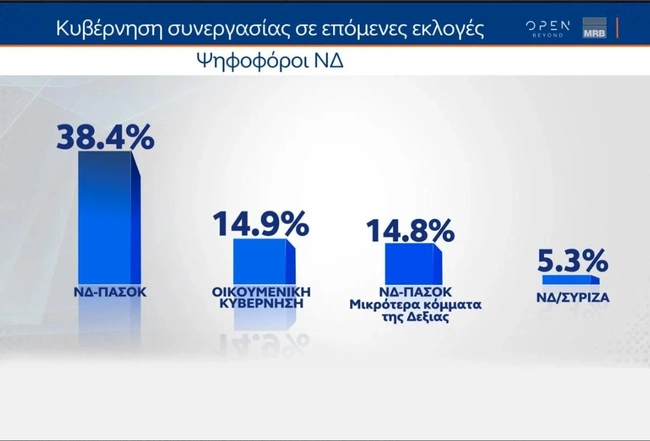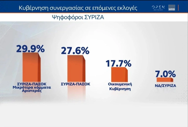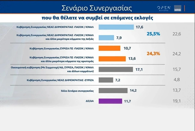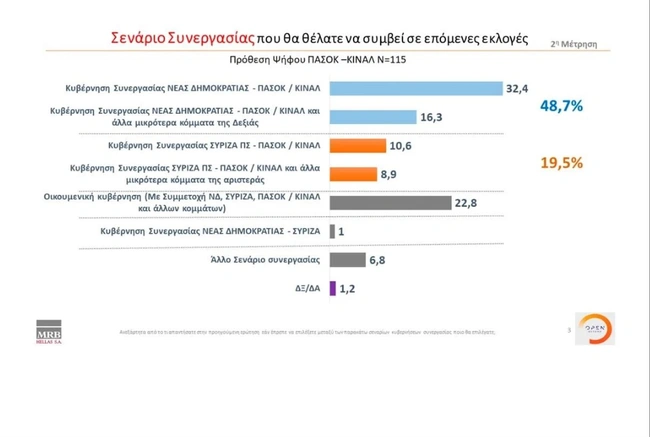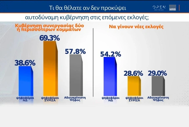 Σε ό,τι αφορά στο ενδεχόμενο να μην προκύψει αυτοδύναμη κυβέρνηση από τις επόμενες εκλογές, η πλειοψηφία των ερωτηθέντων σε ποσοστό 54,2% τάσσεται υπέρ της κυβέρνησης συνεργασίας δύο ή περισσότερων κομμάτων, ενώ το 38,4% θέλει προσφυγή εκ νέου στις κάλπες.