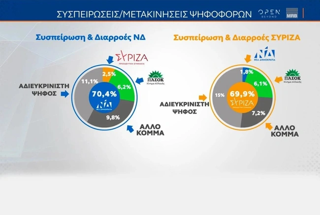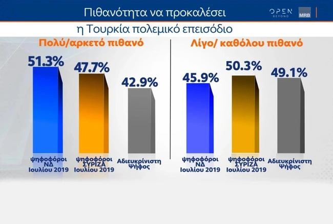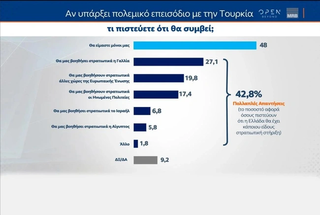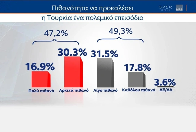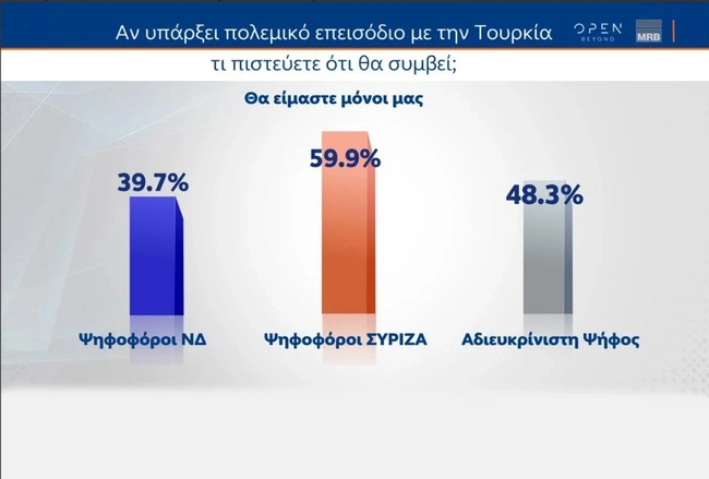 Το δεύτερο μέρος της δημοσκόπησης της MRB για το Open αναλύει τις απόψεις της κοινής γνώμης για τα ελληνοτουρκικά, τις μετακινήσεις ψηφοφόρων και τα σενάρια συνεργασίας στις προσεχείς βουλευτικές εκλογές. Παράλληλα, πρόκειται και για μια «ακτινογραφία» των αναποφάσιστων. Σύμφωνα με τα ευρήματα της δημοσκόπησης που παρουσιάστηκαν στο κεντρικό δελτίο ειδήσεων του καναλιού, το 47,2% ανησυχεί για πιθανή πρόκληση «θερμού» πολεμικού επεισοδίου από την πλευρά της Τουρκίας. Eιδικότερα, οι πολίτες, σε ποσοστό 48%, πιστεύουν πως σε ένα ενδεχόμενο επεισόδιο με την Τουρκία, θα είμαστε μόνοι μας, ενώ ένα 27,1% λέει πως θα μας βοηθήσει η Γαλλία. Το 19,8% των ερωτηθέντων υποστηρίζει πως θα μας βοηθήσουν στρατιωτικά άλλες χώρες της ΕΕ.