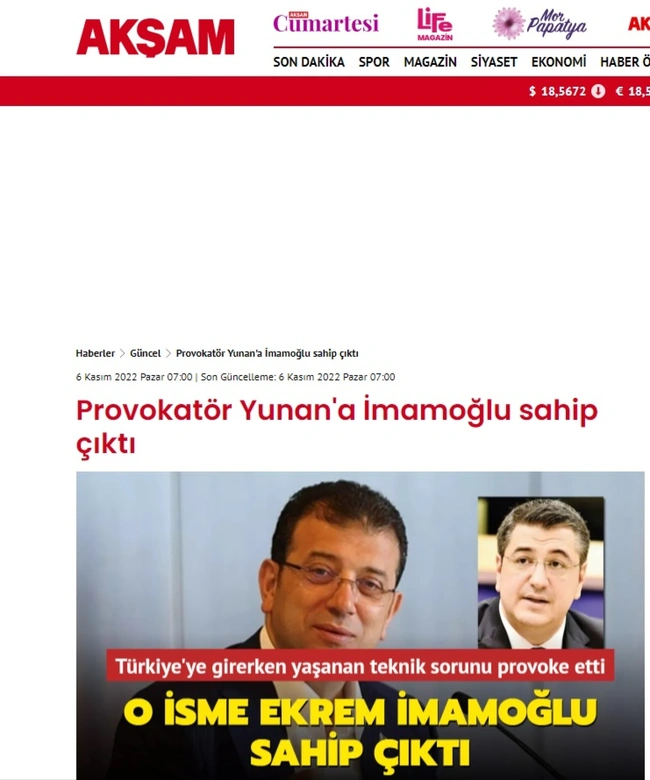 Η τουρκική εφημερίδα «Aksam» φέρει τον χαρακτηριστικό τίτλο: «Ο Ιμάμογλου υπερασπίστηκε τον Ελληνα προβοκάτορα». Στη συνέχεια, το κείμενο της τουρκικής εφημερίδας αναφέρει: «Ελληνας περιφερειάρχης προκάλεσε το τεχνικό πρόβλημα κατά την είσοδό του στην Τουρκία και ο Εκρέμ Ιμάμογλου ήταν αυτός που τον υποστήριξε.