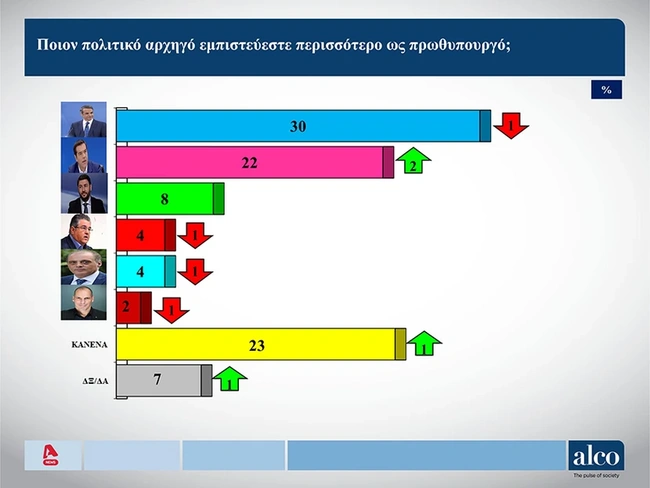Τέλος, το 30% των ερωτηθέντων εμπιστεύεται ως πρωθυπουργό τον Κυριάκο Μητσοτάκη, το 22% τον Αλέξη Τσίπρα, το 8% τον Νίκο Ανδρουλάκη, το 4% «ψηφίζει» Δημήτρη Κουτσούμπα και Κυριάκο Βελόπουλο και το 2% Γιάνη Βαρουφάκη.
