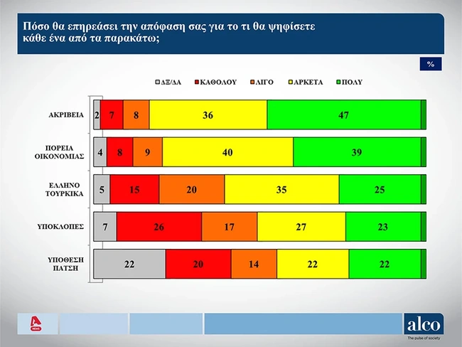 Η ακρίβεια είναι ο παράγοντας που θα διαμορφώσει την ψήφο των πολιτών στις επικείμενες εκλογές, σύμφωνα με δημοσκόπηση της Alco για τον Alpha. Ειδικότερα, το 47% των ερωτηθέντων στην έρευνα που διεξήχθη από 14 μέχρι 18 Νοεμβρίου σε δείγμα 1.000 ανθρώπων, απάντησε ότι η ακρίβεια θα επηρεάσει σε πολύ μεγάλο βαθμό την ψήφο του. Σημαντικοί παράγοντες είναι επίσης η πορεία της οικονομίας, τα ελληνοτουρκικά, οι υποκλοπές, και η υπόθεση Πάτση.