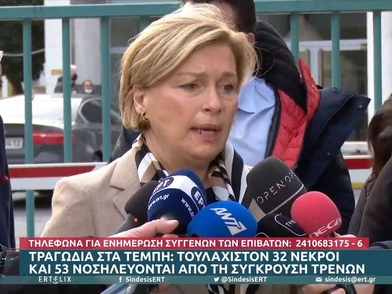 «Είναι τρομερό αυτό που συνέβη. Λυπάμαι πολύ για τους ανθρώπους που χάθηκαν, για τους γονείς των παιδιών που τους περιμένουν. Δεν το χωράει ο νους μας. Έχουν μείνει 14 άτομα για παρακολούθηση στο νοσοκομείο της Λάρισας. θα τους δούμε όλους. Ελπίζω να πάνε όλα καλά από εδώ και πέρα. Έγινε όλη η διαδικασία στα νοσοκομεία πολύ γρήγορα και πολύ σωστά. Οι περισσότεροι τραυματίες είναι εδώ στη Λάρισα, άλλοι στην Κατερίνη και άλλοι στο Γεννηματά. Τους ευχαριστώ όλους και ειλικρινά λυπάμαι πολύ» είπε η υπουργός.