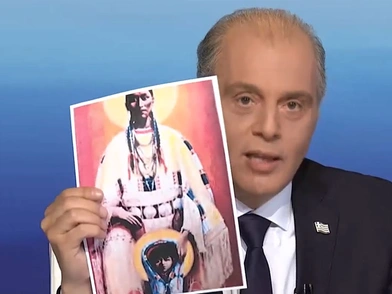 Δύο φωτογραφίες από το βιβλίο των Θρησκευτικών -Ανακαλύπτουµε εικόνες, πρόσωπα και ιστορίες- της 3ης δημοτικού παρουσίασε κατά τη διάρκεια του debate ο πρόεδρος της Ελληνικής Λύσης, Κυριάκος Βελόπουλος συνοδεύοντας την απάντησή του που έκανε λόγο για «ψευτοπροοδευτισμό» και «περίεργα κακέκτυπα στερεότυπα που έρχονται απ’ έξω». Πρόκειται για δύο έργα που παρουσιάζουν, το ένα την Παναγία ως... γκέισα και το άλλο ως ινδιάνα.