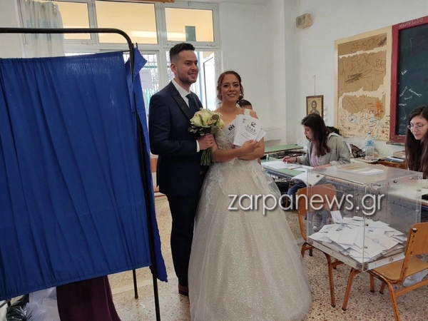 Νύφη και γαμπρός πήγαν να ψηφίσουν στις εκλογές μετά το γάμο τους. Οι δυο τους έκλεψαν τις εντυπώσεις όταν μετέβησαν στο εκλογικό κέντρο της Νέας Κυδωνίας στα Χανιά.
