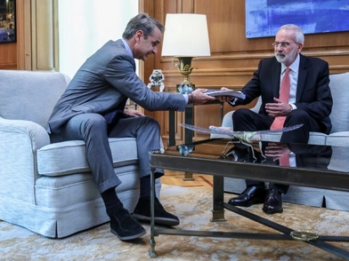 Η στιγμή που ο Κυριάκος Μητσοτάκης δίνει τον φάκελο στον Ιωάννη Σαρμά