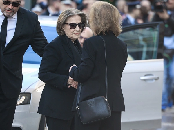 Συντετριμμένη ήταν σήμερα (9/1) στη Μητρόπολη Αθηνών η σύζυγος του, Κώστα Σημίτη, Δάφνη, κατά την εξόδιο ακολουθία για τον πρώην πρωθυπουργό.