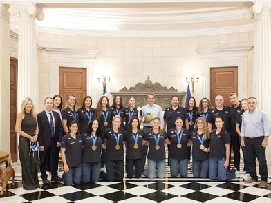Ο Πρωθυπουργός Κυριάκος Μητσοτάκης και η σύζυγός του Μαρέβα Γκραμπόφσκι - Μητσοτάκη υποδέχτηκαν σήμερα στο Μέγαρο Μαξίμου την εθνική ομάδα πόλο γυναικών, η οποία πριν λίγες ημέρες κατέκτησε το χρυσό μετάλλιο στο Παγκόσμιο Πρωτάθλημα στη Σιγκαπούρη.