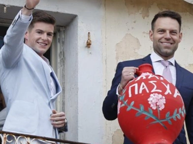 Ο Στέφανος Κασσελάκης και ο σύζυγός του, Τάιλερ Μακμπέθ, συμμετείχαν στο έθιμο των μπότηδων που πραγματοποιείται κάθε Μεγάλο Σάββατο το πρωί, κατά το οποίο οι κάτοικοι βγαίνουν στα μπαλκόνια τους και πετούν τα πήλινα δοχεία.