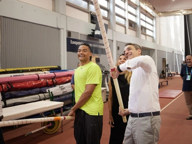 Για παράδειγμα, είδε από κοντά το σκάμμα όπου προπονείται ο Μίλτος Τεντόγλου, περιεργάστηκε το κοντάρι με το οποίο κάνει άλματα ο Εμμανουήλ Καραλής, ενώ δεν δίστασε να τρέξει στο κατοστάρι με τον Χρυσό Ολυμπιονίκη του Τόκιο Νάσο Γκαβέλα – φορώντας στο χέρι το ειδικό «σκοινάκι» με το οποίο αγωνίζεται με τον συναθλητή του ο τυφλός πρωταθλητής.