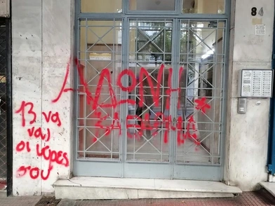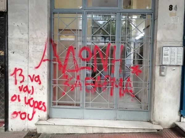 Με συνθήματα γέμισαν άγνωστοι την είσοδο του κτιρίου όπου στεγάζεται το πολιτικό γραφείο του υπουργού Εργασίας και Κοινωνικών Ασφαλίσεων, Άδωνι Γεωργιάδη, με αφορμή, όπως όλα δείχνουν, το νέο νομοσχέδιο για τα εργασιακά.