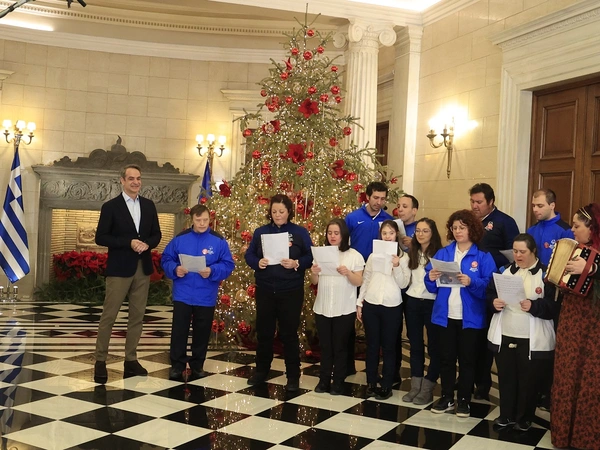 Λίγο μετά τις 10:00 το πρωί ο πρωθυπουργός άνοιξε τις πόρτες του Μεγάρου Μαξίμου σε αθλητές και αθλήτριες των Special Olympics Hellas, αλλά και μέλη της Πανθρακικής Ομοσπονδίας Νότιας Ελλάδας, οι οποίοι αφού τραγούδησαν τα παραδοσιακά κάλαντα αντάλλαξαν ευχές με τον κ. Μητσοτάκη.