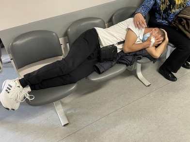 Στη φωτογραφία φαίνεται ένας άνδρας ο οποίος μετά το χειρουργείο βρίσκεται σε διαδικασία ανάνηψης, ξαπλωμένος στις καρέκλες στο χώρο αναμονής του 4ου ορόφου του νοσοκομείου. Ο άνδρας είχε υποβληθεί σε ενδοσκοπικές εξετάσεις και οι γιατροί τον ξάπλωσαν στις καρέκλες για να συνέλθει από τη μέθη.