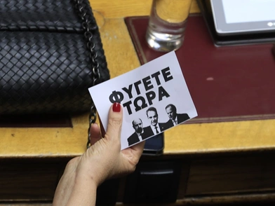 Τα τρικάκια έγραφαν «φύγετε τώρα» και είχαν τις φωτογραφίες του Κυριάκου Μητσοτάκη, του Χρήστου Τριαντόπουλου και του Κώστα Καραμανλή.