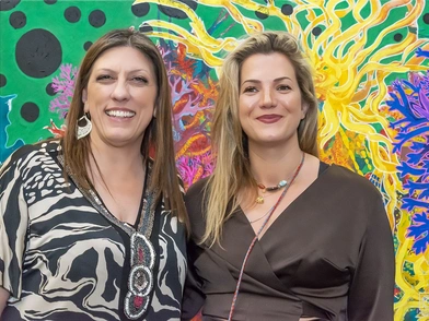Η Elena Kos υποδέχθηκε με μεγάλη χαρά την αδελφή της, Ζωή Κωνσταντοπούλου, την οποία, μάλιστα, ξενάγησε προσωπικά στα έργα της έκθεσης.