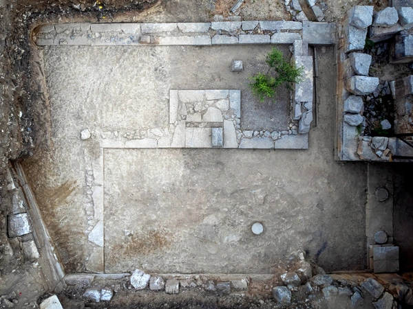Στη φετινή ανασκαφή επίσης, εκτός από μία βάση διπλού πελέκεως που είχε αποκαλυφθεί παλαιότερα, βρέθηκε μία ακόμη, πυραμιδοειδής βάση στην εξέδρα, ενώ πιθανή είναι και η ύπαρξη τρίτης, καθώς σώζεται αποσπασματικά στον δυτικό βραχίονα.