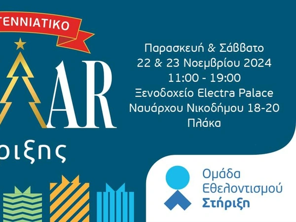 Χριστουγεννιάτικο bazaar για την υποστήριξη άπορων οικογενειών οργανώνει η Ομάδα Εθελοντισμού «Στήριξη» την Παρασκευή 22 και το Σάββατο 23 Νοεμβρίου, στο ξενοδοχείο Electra Palace, Ναυάρχου Νικοδήμου 18-20, στην Πλάκα.