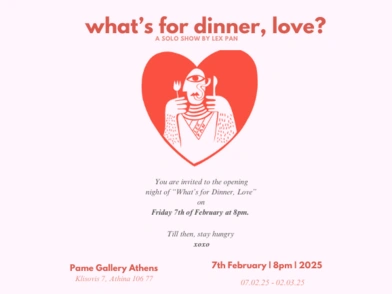 Στην τέταρτη ατομική της έκθεση, “What’s for Dinner, Love?”, η Lex στρέφει το βλέμμα της στην πιο οικεία πράξη: το φαγητό, ένα στοιχείο βαθιά ερωτικό, αλλά και θεμελιώδες για την ανθρώπινη επιβίωση.