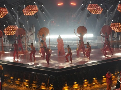 00:23 Οι περσινοί νικητές της Eurovision, Maneskin, ροκάρουν πάνω στη σκηνή με το νέο τους κομμάτι Super Model. Ο frontman τους, Damiano, κουτσαίνει καθώς σήμερα είναι η πρώτη ημέρα που άφησε την πατερίτσα του μετά από ένα τραυματισμό στον αστράγαλό του.