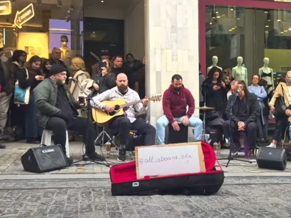 Πρόκειται για την μπάντα «All_Aboard_Έλα», η οποία βρίσκεται συστηματικά στην Ερμού και όπως αναφέρουν οι μουσικοί στη σελίδα της μπάντας στο Facebook, γεννήθηκε στον δρόμο «για να προξενέψουμε την παράδοση με εν@ ροκ γαμπρό».