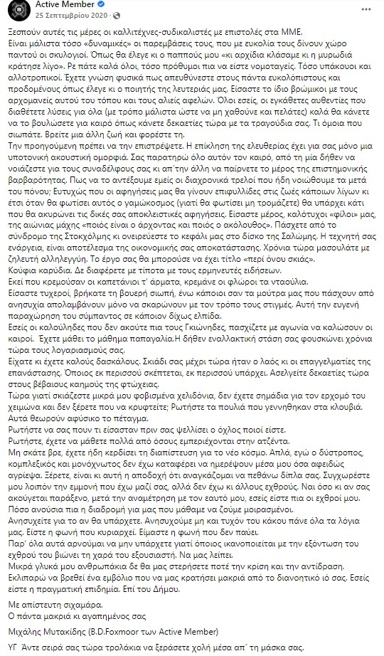 Μεταξύ άλλων ο Μυτακίδης είχε γράψει: «Ξεσπούν αυτές τις μέρες οι καλλιτέχνες-συvδικαλιστές με επιστολές στα ΜΜΕ. Είναι μάλιστα τόσο «δυναμικές» οι παρεμβάσεις τους, που με ευκολία τους δίνουν χώρο παντού οι σκυλογιοί. Ρε πάτε καλά όλοι, τόσο πρόθυμοι πια να είστε νομοταγείς. Τόσο υπάκουοι και αλλοτροπικοί. Έχετε γνώση φυσικά πως απευθύνεστε στους πάντα ευκολόπιστους και προδομένους όπως έλεγε κι ο ποιητής της λευτεριάς μας. Είσαστε το ίδιο βρώμικοι με τους αρχομανείς αυτού του τόπου και τους αλιείς αφελών. Όλοι εσείς, οι εγκάθετες αυθεντίες που διαθέτετε λύσεις για όλα (με τρόπο μάλιστα ώστε να μη χαθούνε και πελάτες) καλά θα κάνετε να το βουλώσετε για καιρό όπως κάνετε δεκαετίες τώρα με τα τραγούδια σας. Τι όμοια που σιωπάτε. Βρείτε μια άλλη ζωή και φορέστε τη.