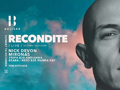 Αυτή την Κυριακή 16 Οκτώβρη το Bolivar και η Minotaur-Minotaur παρουσιάζουν τoν dj/producer Recondite (live). O Γερμανός καλλιτέχνης έχει βραβευτεί ως το καλύτερο live act και έχει παραγωγές σε labels όπως Afterlife , Dystopian, Plangent. Μαζί του οι Nick Devon , Mironas, Steph b2b Andianna, Ezara, Rezo b2b Magda Kay.