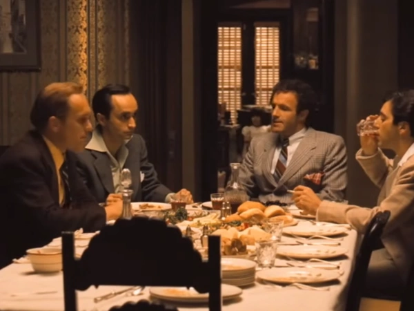 Στη συγκεκριμένη σκηνή κάθονται σε ένα τραπέζι ο Μάικλ Κορλεόνε (Αλ Πατσίνο), μαζί με τους Φρέντο Κορλεόνε (Τζον Καζάλ), Σόνι Κορλεόνε (Τζέιμς Κάαν) και τον κονσιλιέρε, Τομ Χάγκεν (Ρόμπερτ Ντιβάλ).