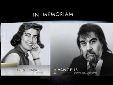 Υπό τους ήχους του τραγουδιού «Calling All Angels» από τον βραβευμένο με Grammy μουσικό Λένι Κράβιτζ (Lenny Kravitz) στη σκηνή παρουσιάστηκε το βίντεο-αφιέρωμα που περιελάμβανε μεταξύ άλλων τους Ρέι Λιότα (Ray Liotta), Αντζελα Λάνσμπερι (Angela Lansbury), Ράκελ Γουέλς (Raquel Welch), Τζέιμς Κάαν (James Caan) και Τζίνα Λολομπριγκίτα (Gina Lollobrigida). Ανάμεσά τους ήταν ο Βαγγέλης Παπαθανασίου και η Ειρήνη Παπά. Η τελευταία φωτογραφία ήταν αφιερωμένη στον Ουόλτερ Μίρις (Walter Mirisch) παραγωγό και πρώην πρόεδρο της Ακαδημίας.
