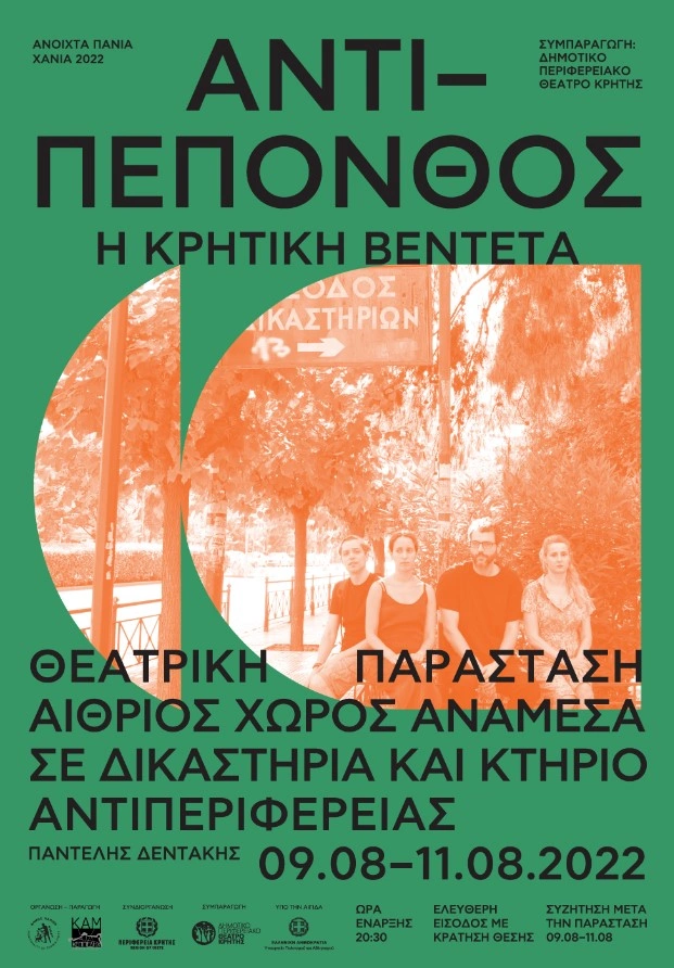 Tη θεατρική παράσταση «Αντιπεπονθός-Η κρητική βεντέτα» θα παρουσιάσει το Δημοτικό Περιφερειακό Θέατρο Κρήτης σε όλο το νησί. Η παράσταση «ανεβαίνει» στο πλαίσιο του προγράμματος «Ανοιχτά Πανιά 2022» του Δήμου Χανίων και της πολιτιστικής επιχείρησης του Δήμου ΚΕΠΠΕΔΗΧ-ΚΑΜ με ελεύθερη είσοδο για το κοινό και παρουσιάζεται με την υποστήριξη των Δήμων Χανίων, Ρεθύμνου, Ηρακλείου και Αγίου Νικολάου.