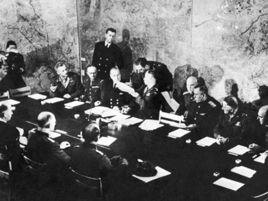 - Προτείνω στη γερμανική αντιπροσωπεία να πλησιάσει εδώ, στο τραπέζι. Εδώ θα υπογράψετε την πράξη της παράδοσης της Γερμανίας.