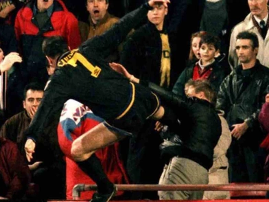 Ο επόπτης το είδε, ενημέρωσε τον διαιτητή και εκείνος έδειξε την κόκκινη κάρτα στον Καντονά ο οποίος πήρε το δρόμο προς τα αποδυτήρια σχεδόν αδιαμαρτύρητα. Ενώ περπατούσε έξω από τις γραμμές του γηπέδου, ένας οπαδός της Κρίσταλ Πάλας φάνηκε να του λέει κάτι σε έντονο ύφος και τότε ο Καντονά μετατράπηκε σε... Μπρους Λι και με μια εναέρια κλωτσιά που θα ζήλευαν δάσκαλοι πολεμικών τεχνών τον χτύπησε.