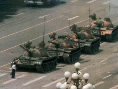 Αλλά ας επιστρέψουμε σε εκείνες τις ταραγμένες ημέρες. Την 5η Ιουνίου, την επόμενη δηλαδή, της μεγάλης σφαγής, στη βόρεια πλευρά της πλατείας, εμφανίστηκε ένας άνδρας ο οποίος φορούσε άσπρο πουκάμισο και μαύρο παντελόνι ενώ στα χέρια του κρατούσε σακούλες με ψώνια. Μπροστά του βρίσκονται τέσσερα άρματα μάχης, το ένα πίσω από το άλλο.