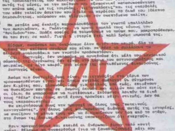 Η 12σελιδη προκήρυξη στάλθηκε στην εφημερίδα «Ελευθεροτυπία» στις 9 Οκτωβρίου 1989, είχε τίτλο «Άρχισε η κάθαρση» και μεταξύ άλλων ανέφερε ότι: